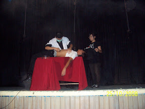 Pasiennya memuntahkan darah kental kehitaman, paku dan jarum di bawah sorotan lampu yang sangat terang di bawah tatapan mata 2000 orang lebih.